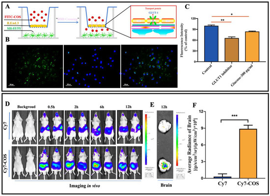 To investigate the BBB penetration ability of COS, the fluorescence intensity in the lower chamber was detected. As shown in Figure 2B, FITC-labeled COS penetrated through monolayer of bEnd.3 cells and were distributed around or inside SH-SY5Y cells, suggesting that COS could easily penetrate across the BBB in vitro model. To determine whether any transporters are required for their BBB penetration, inhibitor of GLUT1 (WZB117) was added. Compared to the control group, reduced fluorescence intensity of FITC-COS was observed in the lower chamber (p < 0.01), indicating that WZB117 decreased the permeation ability of COS across the BBB (Figure 2C). Meanwhile, considering that GLUT1 was one of the influx glucose transporters, competitive inhibition of glucose with COS was examined, and the results showed that the fluorescence intensity was significantly lower due to glucose administration (p < 0.05) (Figure 2C). These results demonstrated that GLUT1 was one of the transporters accounting for BBB penetration of COS.