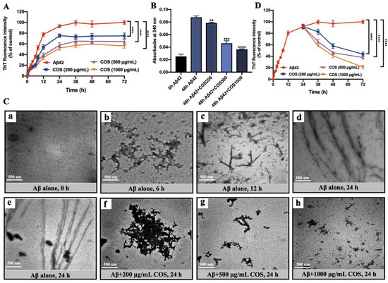 To investigate whether COS could disaggregate preformed mature Aβ42 fibrils, 20 μM Aβ42 was pre-incubated at 37 °C for 24 h to form mature fibrils. As shown in Figure 3D, the ThT fluorescence intensity curve showed a plateau phase after 24 h, suggesting that the fibrillation process reached an equilibrium and the pre-incubation time was long enough to form mature fibrils. However, a remarkable reduction in ThT fluorescence intensity of Aβ42 fibrils was observed with the addition of COS in a dose-dependent manner as compared with Aβ42 alone (p < 0.0001). Our results indicated that COS could promote disaggregation of preformed mature Aβ42 fibrils in a dose-dependent manner (Figure 3D).