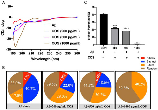 CD spectroscopy was used to investigate the effects of COS on conformational transition of Aβ42 (Figure 4). After incubated for 24 h, the CD spectrum of Aβ42 showed a positive peak at around 195 nm and a negative valley at around 214 nm (Figure 4A), which corresponded to a mixture of α-helix and β-sheet structures. From Figure 4B, the secondary structures of pure Aβ42 fibrils were mainly composed of α-helix (about 9.3%), β-sheet (about 40.7%), β-turn (about 17.0%), and random coil structures (about 33.0%). However, the positive peak appeared at around 195 nm diminished gradually which indicated that the percentage of β-sheet structures were obviously decreased with the addition of COS as concentration was increased (p < 0.001 or 0.0001) (Figure 4C). By contrast, 22.0% of β-sheet structures were formed in the presence of 200 μg/mL COS, which was less than those of the Aβ42 group (p < 0.001). When the concentration of COS was increased to 1000 μg/mL, the β-sheet structures almost completely disappeared after 24 h of incubation (Figure 4B). The decreased β-sheet structures with a concomitant increase in random coil structures indicated the remarkable inhibitory effects of COS on formation of amyloid fibrils (Figure 4B).