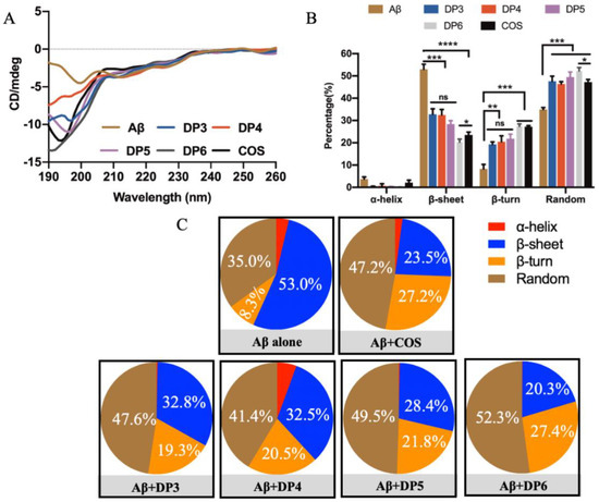 In addition, effects of COS monomers with different DPs on conformational transitions of Aβ42 were also investigated (Figure 5A). The concentrations of COS monomers used in CD spectroscopy assay was consistent with their respective weight percentages determined by HPLC. The result showed that the typical CD spectra of Aβ42 were changed extremely by treatment with COS monomers with different DPs (Figure 5A). And the percentage of β-sheet in Aβ42 was significantly reduced in the presence of COS in a DP-dependent manner (p < 0.001 or 0.0001) (Figure 5B,C). It is remarkably notable that COS monomer with DP6 was the most effective one in inhibiting formation of β-sheet structures (Figure 5B). Therefore, it was concluded that COS could reduce the β-sheet contents in a dose- and DP-dependent manner.