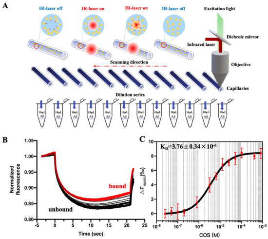Aβ42 was labeled using the MonolithTM RED-NHS Protein Labeling Kit (NanoTemper Technologies, Munich, Germany) according to the manufacturer’s instructions. Labeled Aβ42 was used at a concentration of 4 μM, while non-fluorescent labeled COS as binding ligands were titrated in 1:1 dilution series (concentrations between 800 μM and 12.2 nM). The same procedures were repeated for COS monomers with different DPs, and the highest final concentrations for each COS monomer with different DPs were 8.7 mM DP3, 7.5 mM DP4, 0.6 mM DP5, and 0.5 mM DP6, respectively.