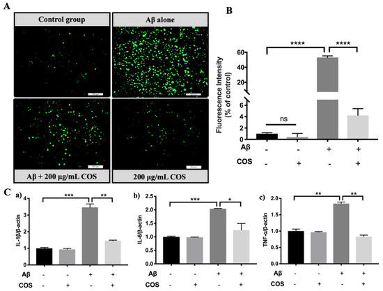 To investigate the effects of COS on Aβ42-induced oxidative stress and neuroinflammation, microglial BV2 cells were stimulated with Aβ42 in the presence or absence of COS, and reactive oxygen species (ROS) and pro-inflammatory cytokines were analyzed. The effects of COS on ROS production were illustrated by 2,7-Dichlorodi-hydrofluorescein diacetate (DCFH-DA) fluorescent probe. As shown in Figure 9A, the green fluorescence was markedly stronger in the Aβ42 treated group than the untreated control group, indicating an increased ROS level induced by Aβ42 (p < 0.0001). However, the addition of 200 μg/mL COS significantly suppressed generation of Aβ42-induced ROS which was illustrated by the weakened green fluorescence intensity (p < 0.0001) (Figure 9B). Our results indicated that COS significantly inhibited the generation of ROS induced by Aβ42 oligomers.