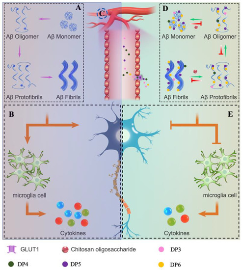 Schematic diagram showing how COS interfered with Aβ42 aggregation and alleviated Aβ42-induced cytotoxicity. (A) Schematic representation of the process of Aβ aggregation. (B) Aβ self-assembles into well-ordered aggregates containing β-sheet-rich structures, leading to neuroinflammation and neuronal damage. (C) COS could penetrate through BBB and GLUT1 was one of the transporters accounting for their penetration. (D) COS could bind with Aβ42 peptide directly and inhibit Aβ42 assembly in a dose- and DP-dependent manner. (E) COS significantly alleviated amyloid-induced neuronal damage and release of inflammatory cytokines via interfering with Aβ42 aggregation.