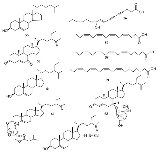A novel sterol: cholest-5-en-3-ol (55) isolated from green alga Ulva prolifera has potent antialgal activity against the typical hazardous red tide microalgae [61]. Mao [63] showed that new polyacetylenic fatty acid, (8E,12Z,15Z)-10-hydroxy-8,12,15-octadecatrien-4,6-diynoic acid (56); five known metabolites, including two linear diterpenes (3 and 4); and three sterols (5–7) were confirmed in the Chinese green algae Caulerpa racemosa. Trans-phytyl acetate (4) was first isolated from this species, before it was previously isolated from the green algae, Ulva pertusa [64].