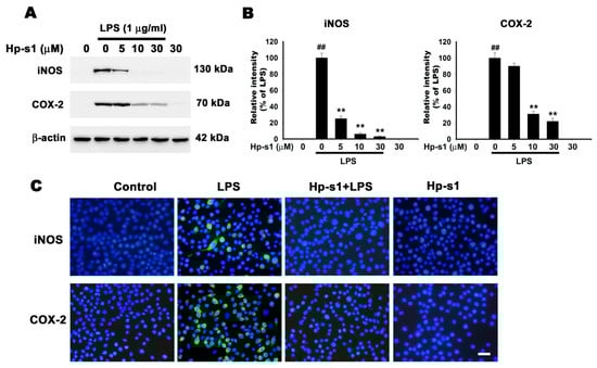 Figure 2. Hp-s1 suppresses the lipopolysaccharide (LPS)-induced expression of iNOS and COX-2 in a dose-dependent manner. (A) The cells were pretreated with Hp-s1 (5, 15, or 30 μM) for 2 h and then treated with or without LPS (1 μg/mL) for another 8 h. Total lysates were collected, and the protein levels of iNOS and COX-2 were detected via Western blot analysis. β-actin was used as an internal control. (B) The protein bands of each regimen were quantified through densitometry. Data were expressed as the percentage of the LPS-treated group (mean ± S.D., n = 3). ## p < 0.01 vs. the control group; ** p < 0.01 vs. the LPS-treated group. (C) Immunofluorescence staining for iNOS and COX-2. Cells were pretreated with 30 μM Hp-s1 for 2 h and then stimulated with or without LPS (1 μg/mL) for 8 h. The cells were immunostained with anti-iNOS and anti-COX-2 antibodies. The nuclei (blue) were stained with 4′,6-diamidino-2-phenylindole (DAPI). Bar = 30 μm.