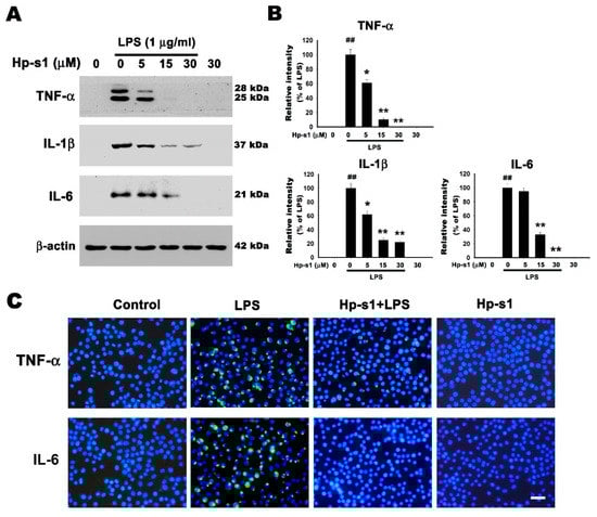 Figure 3. Hp-s1 suppresses proinflammatory cytokines in LPS-stimulated microglial cells. (A) The cells were pretreated with different Hp-s1 concentrations (5, 15, or 30 μM) in the absence or presence of LPS (1 μg/mL) for 8 h and then subjected to Western blot analysis with anti-TNF-α, anti-IL-1β, and IL-6 antibodies; β-actin was used as an internal control. (B) The protein bands of each regimen were quantified via densitometry. Data were expressed as the percentage of the LPS-treated group (mean ± S.D., n = 3). ## p < 0.01 vs. the control group; * p < 0.05 and ** p < 0.01 vs. the LPS-treated group. (C) Immunofluorescence staining for TNF-α. and IL-6. The cells were pretreated with 30 μM Hp-s1 for 2 h and then stimulated with or without LPS (1 μg/mL) for 8 h. The cells were immunostained with anti-TNF-α and IL-6 antibodies. The nuclei (blue) were stained with DAPI. Bar = 30 μm.