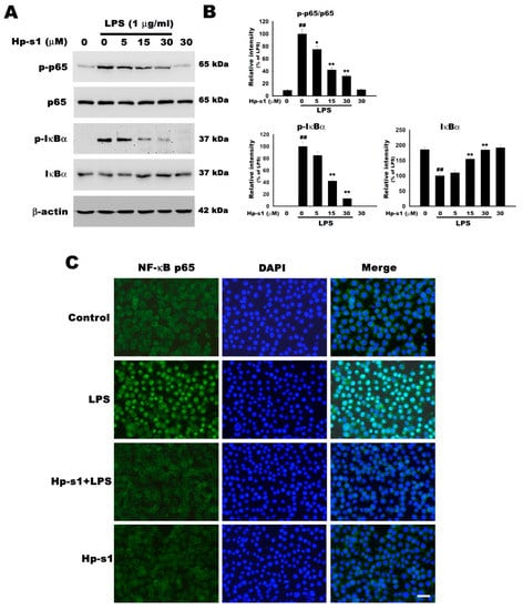 Figure 4. Hp-s1 inhibits the LPS-induced NF-κB activation. (A) The cells were pretreated with different Hp-s1 concentrations (5, 15, or 30 μM) for 2 h and then stimulated with LPS (1 μg/mL) for 1 h. Cell lysates were subjected to Western blot to determine the protein levels of p-p65, p65, p-IκBα, and IκBα. β-actin was used as an internal control. (B) The protein bands of each regimen were quantified via densitometry. Data were expressed as the percentage of the LPS-treated group (mean ± S.D., n = 3). ## p < 0.01 vs. the control group; * p < 0.05 and ** p < 0.01 vs. the LPS-treated group. (C) Immunofluorescence analysis of NF-κB translocation. The cells were pretreated with Hp-s1 (30 μM) for 2 h and then activated with LPS (1 μg/mL) for 1 h. The translocation of the p65 subunit of NF-κB was determined via immunocytochemistry using anti-p65 NF-κB antibody. The nuclei (blue) were stained with DAPI. Scale bar = 30 μm.