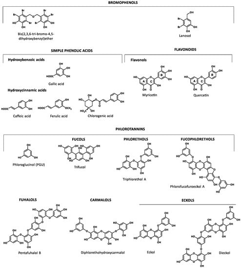 Examples of the families of phenolic compounds found in marine sources: bromophenols, simple phenolic acids and flavonoids, different types of phlorotannins (fucols, phlorethols, fucophlorethols, fuhalols, carmalols and eckols, as well as phloroglucinol monomeric unit).