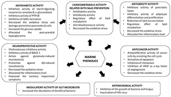 Phenolic compounds from marine organisms are far less studied than those from terrestrial sources since their structural diversity and variability require powerful analytical tools. However, both their biological relevance and potential properties make them an attractive group deserving increasing scientific interest. The use of efficient extraction and, in some cases, purification techniques can provide novel bioactives useful for food, nutraceutical, cosmeceutical and pharmaceutical applications. The bioactivity of marine phenolics is the consequence of their enzyme inhibitory effect and antimicrobial, antiviral, anticancer, antidiabetic, antioxidant, or anti-inflammatory activities. This review presents a survey of the major types of phenolic compounds found in marine sources, as well as their reputed effect in relation to the occurrence of dietary and lifestyle-related diseases, notably type 2 diabetes mellitus, obesity, metabolic syndrome, cancer and Alzheimer’s disease. In addition, the influence of marine phenolics on gut microbiota and other pathologies is also addressed.