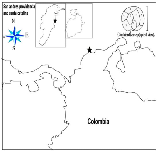 Colombian Atlantic coast and, at the top, a dinoflagellate representative of the Gambierdiscus sp. (for each of the 6 plates that are distinguished in the apical view, the bar represents 200 micrometers). The stars represent places where ciguatoxin fish poisoning (CFP) cases have been reported.