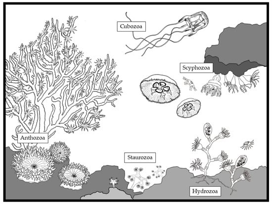 The phylum Cnidaria includes five main classes: Hydrozoa, Scyphozoa, Cubozoa, Staurozoa and Anthozoa (Table 1; Figure 1). Basically, the unit organism in Cnidaria is the polyp, a sessile, small (from few millimeters to less than two centimeters) gastrovascular cavity surrounded by three layers (an internal endodermis, and an external ectodermis with an intermediate matrix, the mesoglea). The mouth of the polyp is surrounded by tentacles, which facilitate prey capture []. Polyps form different types of colonies in Hydrozoa and Anthozoa. Conversely, they live as single individuals in Scyphozoa, Cubozoa and Staurozoa. In addition to the polyp stage, Hydrozoa, Scyphozoa, Cubozoa and Staurozoa have a freely swimming pelagic stage (medusa), which co-exists with the polyp stage. The fact that Hydrozoa, Scyphozoa and Cubozoa have a metagenic life cycle (Table 1) suggests that they may have evolutionary separated from Anthozoa, which have only the polyp stage (Table 1). Phylogenetic analyses confirmed that Anthozoa appeared earlier than the other three classes within the evolutionary history of Metazoa, because they possess a circular DNA, in contrast with Hydrozoa, Scyphozoa and Cubozoa, which have a linear DNA [].