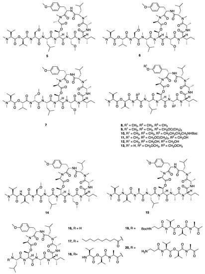 - Nabika, R.; Suyama, T.L.; Hau, A.M.; Misu, R.; Ohno, H.; Ishmael, J.E.; McPhail, K.L.; Oishi, S.; Fujii, N. Synthesis and biological evaluation of the [d-MeAla11]-epimer of coibamide A. Bioorg. Med. Chem. Lett. 2015, 25, 302–306. [Google Scholar] [CrossRef] [PubMed]