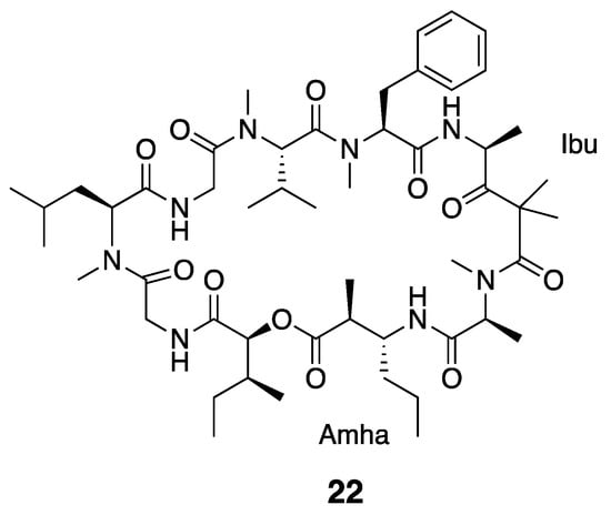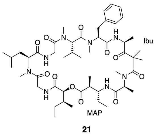 Ibu-epidemethoxylyngbyastatin 3 (22) has a similar structural backbone to dolastatin 12 (21) and possesses the same Ibu residue (Figure 4). However, rather than containing the MAP as in dolastatin 12, Ibu-epidemethoxylyngbyastatin 3 has a molecular mass comparatively increased by 14 Da, which results from the presence of a 3-amino-2-methylhexanoic acid (Amha) moiety instead of MAP. In vitro cytotoxicity testing showed that Ibu-epidemethoxylyngbyastatin 3 (22) is at least 10-fold less toxic than dolastatin 12 (IC50 > 1 µM) against HeLa cells [,].
