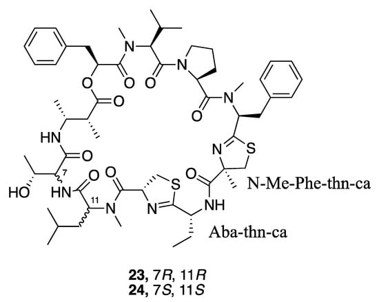 Grassypeptolides are a series of cyclic depsipeptides first isolated from the marine cyanobacterium Lyngbya confervoides. These peptides contain d-amino acids, thiazoline rings, and a β-amino acid (Figure 5) [,]. Further research led to the isolation and description of grassypeptolides D (23) and E (24) from a Red Sea Leptolyngbya sp. RS03, and grassypeptolides F and G from Lyngbya majuscula [,]. Grassypeptolides D (23) and E (24) showed cytotoxic activity to both HeLa cells (IC50 335 and 192 nM, respectively) and neuro2a cells (IC50 599 and 407 nM, respectively) [,,]. By comparing with other grassypeptolide structures and their biological activities, an initial structure–activity relationship was deduced that indicated the N-Me-Phe-thn-ca-Aba-thn-ca tetrapeptide motif could be the key pharmacophore of the grassypeptolides [,].