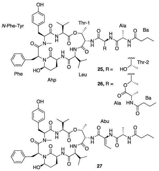 Loggerpeptins A–C (25–27) are cyclic depsipeptides with 3-amino-6-hydroxy-2-piperidone (Ahp) residues (Figure 6) that were isolated from a Florida cyanobacterial collection identified morphologically as Leptolyngbya sp. []. These compounds were screened for serine protease inhibitory activities to assess their antimetastatic effect against breast cancer cells. Loggerpeptin A (25) and B (26) were more potent than loggerpeptin C (27) with IC50s of 0.24 and 0.22 µM against bovine pancreatic chymotrypsin and 0.24 and 0.28 µM against porcine pancreatic elastase []. Loggerpeptin A (25) was 2- and 3-fold more potent than loggerpeptin B (26) and C (27) against human neutrophil elastase (HNE) []. All three compounds exhibited antiproteolytic activities, with IC50 values under 1 µM. As the major component in the collection, loggerpeptin C (27) was subject to a detailed molecular study []. Molecular docking showed that the Leu and N-terminal Thr-1, Abu and Ala residues of loggerpeptin C (27) were binding to the subsites S1-S4 of HNE and porcine pancreatic elastase [].