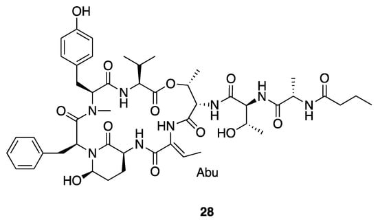 Molassamide (28) is another cyclic depsipeptide (Figure 7) that was isolated along with loggerpeptins A–C (25–27) []. Compared to loggerpeptins (25–27), molassamide (28) exhibited much more potent inhibition activity against porcine pancreatic elastase, with an IC50 value of 50 nM, indicating the Abu residue between Ahp and Thr-1 is important to the antiproteolytic selectivity []. Molassamide presents similar binding patterns in molecular docking as loggerpeptin C (27), with the Abu and N-terminal Thr-1, Thr-2 and Ala binding in subsites S1–S4 of HNE and porcine pancreatic elastase []. Molassamide also inhibited elastase from cleaving the substrate CD40 in both biochemical and cellular assays, and it also inhibited ICAM-1 cleavage and downregulated elastase-induced ICAM-1 gene expression. Overall, this profile of activity is indicative of molassamide being a promising candidate for potential treatment of breast cancer [].