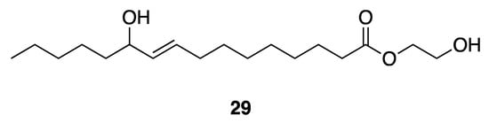 Lumyong et al. isolated an antibacterial compound, 2-hydroxyethyl-11-hydroxyhexadec-9-enoate (29) (Figure 8), from Leptolyngbya sp. LT19 [], as a result of screening for antibacterial activities. They showed compound 25 to be active against Vibrio harveyi and V. parahaemolyticus, with MIC values of 250–1000 and 350–1000 µg/mL. This antibacterial activity could potentially be useful to the shrimp aquaculture industry that is often burdened by the highly damaging Vibrio spp. pathogens []. However, the absolute configuration of the single stereocenter in compound 25 has not yet been determined.