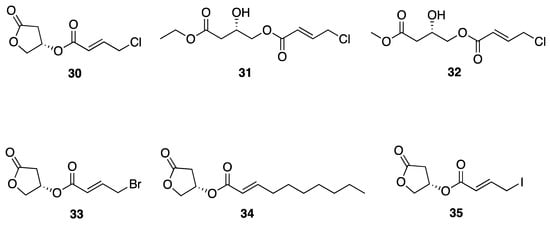 Choi et al. isolated honaucins A–C (30–32) from a Hawaiian collection of Leptolyngbya crossbyana which possess potent anti-inflammatory and quorum-sensing (QS) inhibitory activity (Figure 9) []. Chemical synthesis of honaucin and a number of analogs (30–32) revealed that the each of the functional groups is critical for both of these biological activities. Further, synthetic honaucin analogues 4-bromo-honaucin A (33) and 4′-iodohonaucin A (35) were discovered to have slightly more potent activity in cellular TRAP activity than honaucin A itself (30), with IC50 values of 0.54 and 0.61 μg/mL compared to 0.63 μg/mL for 30 (Figure 9), []. Mechanistic pharmacological investigations of honaucin A (30) indicated that the molecular target(s) involves the Nrf2-ARE (Antioxidant Response Element) pathway, and specifically involves interaction with Cys residues on Keap1 when it is complexed with Nrf2. This allows Nrf2 to be transported to the nucleus, where it activates cytoprotective genes and generates an anti-inflammatory response []. Additionally, further investigation of bromo-honaucin A (33) revealed that it provides a protective effect against bone loss in RANKL-treated murine monocyte/macrophage RAW264.7 cells [].