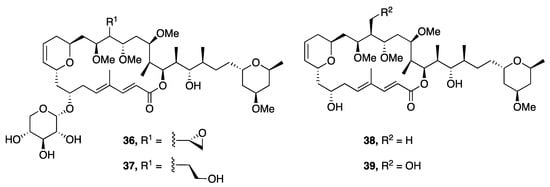 Leptolyngbyolides A–D (36–39), a series of 22-membered macrolides, were isolated from Leptolyngbya sp. collected in Okinawa, Japan. The absolute configuration of each was assigned following an asymmetric total synthesis of leptolyngbyolide C (38) (Figure 10) []. Leptolyngbyolides A–D (36–39) were screened for cytotoxic activity against HeLa S3 cells in vitro and were found to be moderately active, with IC50 values of 0.99, 0.16, 0.64 and 0.15 µM, respectively []. Furthermore, these metabolites possessed actin-depolymerizing activity with an EC50 of 12.6, 11.6, 26.9 and 21.5 µM, and this may represent the mechanism for the observed cellular apoptosis caused by these compounds [].