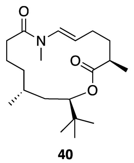 A new macrolide, palmyrolide A (40), was isolated from an environmental assemblage of a Leptolyngbya cf. and Oscillatoria spp. collected from Palmyra Atoll in the Central Pacific Ocean (Figure 11). Palmyrolide A (40) comprises a rare N-methyl enamide functionality, as well as an intriguing t-butyl branch that likely results biosynthetically from the incorporation of malonate and three methyl groups from S-adenosyl-l-methionine (SAM), as shown for apratoxin [,]. The absolute configuration of this molecule was assigned by total synthesis of both the natural (−)-palmyrolide A (40) and its enantiomer, (+)-ent-palmyrolide A. This was necessitated because the t-butyl substituent apparently provides the lactone ester bond with resistance to hydrolysis, precluding chemical degradation studies [,,]. It was speculated that cyanobacterial secondary metabolites possessing this motif, a t-butyl adjacent to an ester, might be stable under a wide variety of environmental conditions, similar to what was observed in the laboratory environment. Palmyrolide A (40) exhibited potent inhibition of calcium oscillations in murine cerebrocortical neurons and sodium channel-blocking activity in neuroblastoma (neuro2a) cells [].