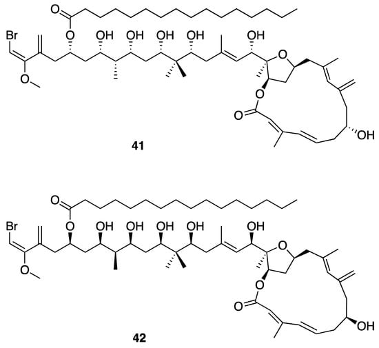 Phormidolide (41) is a 16-membered macrocyclic lactone polyketide-derived metabolite that was discovered from an Indonesian Leptolyngbya sp. (ISB3NOV94-8A) (Figure 12). This molecule has several unique structural features including a large number of hydroxy and methyl groups on the carbon backbone, several points of both cis and trans unsaturation, and a vinyl bromide at one terminus. Phormidolide (41) showed in vitro brine shrimp toxicity, with an LC50 of 1.5 µM. Multiple NMR experiments, including GHMBC, 2D INADEQUATE, and ACCORD-ADEQUATE, G-BIRDR, X-HSQMBC NMR experiments, enabled a J-based configuration analysis and deduction of relative configuration of stereocenters; a variable temperature Mosher ester analysis was used to assign the absolute configuration []. An investigation of the biosynthetic pathway for phormidolide (41) used a genome sequencing approach, and identified the phormidolide biosynthetic gene cluster (phm). The phormidolide (41) gene cluster was found to be of the trans-AT PKS type, which has been relatively rarely reported in cyanobacteria. This was based on finding two discrete trans-AT open reading frames along with KS-AT adaptor regions (ATd) within the PKS megasynthase. The megasynthase possesses ketosynthases, ketoreductases, KS-AT adaptor regions, dehydratases, methyltransferases, O-methyltransferase, enoyl-CoA hydratases, an FkbH-like domain, a pyran synthase, an NRPS-like condensation domain and an acyl carrier protein that were consistent with structure of phormidolide (41). The biosynthetic pathway also provided further supporting evidence for the absolute configuration of phormidolide (41), due to the stereospecificity of the ketoreductases observed in phm compared with known homologues []. However, subsequent chemical synthesis of key fragments of phormidolide revealed the need for a revision in configuration in at least one stereocenter []. Simultaneously, a reanalysis of the biosynthetic gene cluster suggested additional revisions in configuration were possibly required []. These findings stimulated a concerted computational and NMR-based re-investigation of phormidolide’s complex 3-dimensional structure, leading to a revision in several stereocenters (42) [].