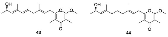 Kalkipyrone A (43) was first reported in a mixed assemblage of Lyngbya majuscula and Tolypothrix sp. (Figure 13), and was found to have potent brine shrimp toxicity (LD50 = 1 µg/mL) and ichthyotoxicity against Carassius auratus goldfish (LD50 = 2 µg/mL) []. Kalkipyrone A (43) and its analogue kalkipyrone B (44) were later found as metabolites of a Leptolyngbya sp. (ASG15JUL14-6) collected from America Samoa (Figure 12) []. Kalkipyrone A (43) and B (44) were moderately toxic to a Saccharomyces cerevisiae strain lacking 16 ATP-binding cassette transporter pump genes (ABC16-monster strain; IC50 = 14.6 and 13.4 µM, respectively), while the in vitro cytotoxicity of these two natural products against H460 human lung cancer cells was somewhat more potent (EC50 = 0.9 and 9.0 µM, respectively) [].