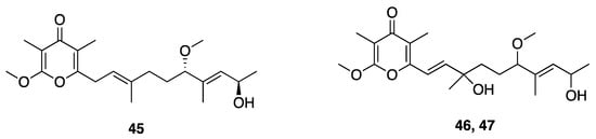 Three related γ-pyrone-containing polyketides described as yoshinones A, B1, and B2 (45–47), were isolated from Leptolyngbya sp. collected from Ishigaki island Okinawa, Japan (Figure 14). The absolute configuration of each compound was attempted by a modified Mosher’s method; however, these failed possibly as a result of the low amounts of samples available []. Thus, to assign the absolute configuration and provide sufficient amounts for further research, the absolute stereochemistry was achieved through total synthesis and comparison of NMR and chiroptical properties between the natural product and synthetic standards []. Yoshinone A (45) was found to inhibit adipogenic differentiation against 3T3-L1 cells, with an EC50 of 420 nM and with little cytotoxicity (IC50 = 63.8 µM to S. cerevisiae ABC16-monster cell) [,]. The adipogenic differentiation against 3T3-L1 cells of yoshinone B1 (46) and B2 (47) was considerably less potent, with less than 50% activity observed at tested concentrations up to 5 µM []. Further examination of structure–activity relationships in this drug class indicated that the position of the pyrone ring and side chain olefin are important for the inhibition of adipogenic differentiation. Further in vitro and in vivo experiments showed that yoshinone A (45) stimulates lactate accumulation deriving from the glycolytic system, and increases fat utilization to compensate for an insufficient energy supply []. These properties could possibly support the utility of yoshinone A in anti-obesity indications.