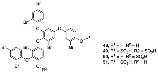 A series of brominated polyphenolics, crossbyanols A–D (48–51), were isolated from an extensive benthic Leptolyngbya crossbyana bloom in Hawaii (Figure 15) []. In addition to the high level of bromination, crossbyanol B–D (49–51) also have sulfated phenolic functionalities. These metabolites were suggested to play a role in the observed coral toxicity caused by the overgrowing cyanobacteria. Crossbyanol A (48) was found to activate sodium influx in mouse neuroblastoma (neuro2a) cells, with an EC50 20 µg/mL, whereas crossbyanol B (49) possessed antibiotic activity, with an MIC of 2.0-3.9 µg/mL against methicillin-resistant Staphylococcus aureus (MRSA). The latter metabolite also showed moderately potent brine shrimp toxicity (IC50 2.8 µg/mL). Crossbyanols C (50) and D (51) were not observed to have biological activity in these tests, and all four compounds were inactive as cytotoxins to H460 human lung cancer cells [].