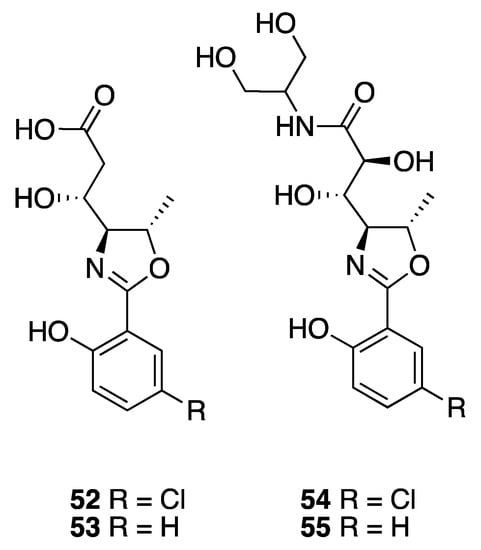 A series of polar oxazolines, named leptazolines A–D (52–55), were isolated from the culture media of a Leptolyngbya sp. (Figure 16) []. Their planar structures were characterized by MS and NMR along with formation of acetate derivatives. Relative configuration was determined by comparison of carbon shifts with those calculated by density functional theory (DFT). Interestingly, the calculations were found to vary as a function of the computer operating system (Ubuntu 16, Windows 10, MAC Mavericks, MAC Mojave). Biological assay showed that leptazoline B (53) modestly inhibited the growth of PANC-1 cells, with a GI50 of 10 µM [], whereas leptazoline A (52) with its aromatic chlorine atom did not show any significant activity to this cell line.