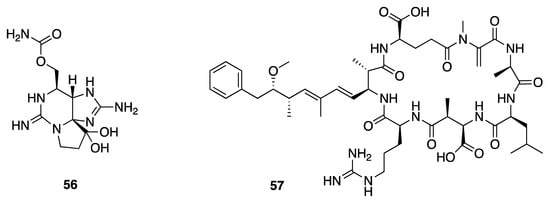 Cyanobacteria are known to produce a variety of toxins, including those that are hepatotoxic, neurotoxic, or cardiotoxic, and which generally increase economic burdens and impact public health []. Cyanobacterial populations are known to sporadically grow excessively to form blooms, and in some cases these are harmful. A total of 34 species from 15 genera and five families were screened for known toxins including the neurotoxic saxitoxin (56) and the hepatotoxic microcystins (e.g., microcystin-LR, 57) (Figure 17) [,,]. Leptolyngbya collections from the Red Sea had on average 58.9 μg/g dry wt. and 438–489 μg/g dry wt. of these two toxin classes, respectively. Toxin production by marine Leptolyngbya poses toxicological risks to marine organisms that may feed on them, or that may be exposed to the cyanotoxins present in seawater [].