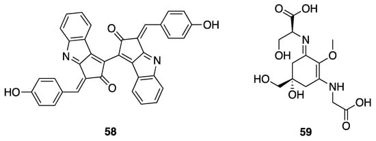 Non-toxic secondary metabolites from cyanobacteria include various chemical classes such as phytohormones, siderophores, and UV-absorbing compounds such as mycosporine amino acids (MAAs) and scytonemin (58); all of these have been reported in Leptolyngbya sp. (Figure 18) [,,]. These latter two series of compounds have been shown to protect photosynthetic cyanobacteria from solar UV damage []. An investigation of UV-B photoprotective compounds in marine Leptolyngbya discovered shinorine (59) (Figure 18), which is now realized to be one of the most dominant MAAs present in several species of cyanobacteria []. Scytonemin has a broader absorption profile than the MAAs, protecting against the solar irradiance damage across the UV (UV-A, -B and -C; 250–425 nm). Interestingly, scytonemin also shows interesting anti-inflammatory activity through inhibition of polo-like kinase stimulated cell proliferation pathways []. The biosynthesis of scytonemin, deriving from the assembly of tyrosine and tryptophan derived components, has been studied at the genomic and mechanistic level in several studies; however, all of these studies have been conducted in other genera of cyanobacteria such as Nostoc punctiforme ATCC 29133 and Lyngbya aestuarii [,,,].