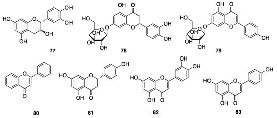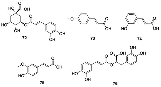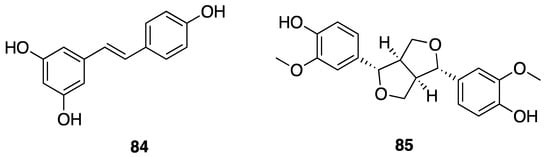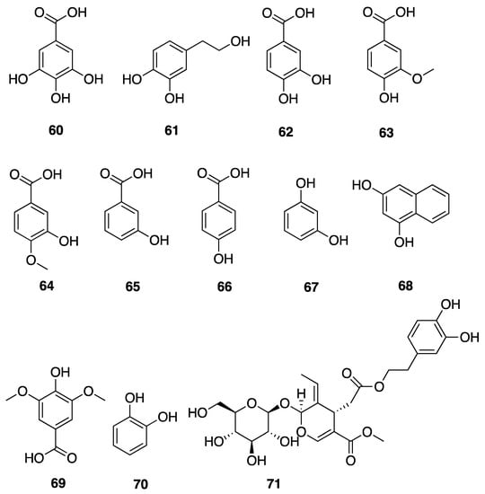 Phenolic compounds, including flavonoids and lignans, are typically natural antioxidants as well as an important group of bioactive compounds []. The extract from a thermophilic cyanobacterium Leptolyngbya sp. collected from northern Tunisia was screened by HPLC and showed the presence of 25 phenolic compounds—gallic acid (60), hydroxytyrosol (61), protocatechuic acid (62), vanillic acid (63), isovanillic acid (64), 3-hydroxybenzoic acid (3-HBA) (65), 4-hydroxybenzoic acid (4-HBA) (66), resorcinol (67), naphtoresorcinol (68), syringic acid (69), catechol (70), and oleuropein (71) (Figure 19); chlorogenic acid (72), dihyrdro-p-coumaric acid (73), dihyrdro-m-coumaric acid (74), ferulic acid (75), and rosamerinic acids (76) (Figure 20); catechin (77), luteolin-7-glucoside (78), apigenin-7-glucoside (79), flavone (80), naringenin (81), luteolin (82), and apigenin (83) (Figure 21); resveratrol (84) and pinoresinol (85) (Figure 22)—demonstrating that Leptolyngbya may constitute a rich source of antioxidant natural products [,]. These compounds also have inherent UV-absorbing properties, albeit at more restricted wavelengths than scytonemin (58).