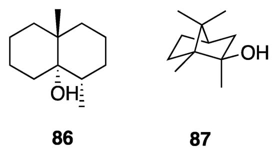 Geosmin (86) and 2-methylisoborneol (87) are two earthy-musty odorous terpenoid secondary metabolites that were first isolated from actinomycetes (Figure 23). Later, these same molecules were found to have a significant presence in many cyanobacteria species. These simple terpenoids have each been reported numerous times as being among the main causes for off-flavors in water and other products []. Wang et al. isolated 86 and 87 from Leptolyngbya bijugata strains, and quantified each at 13.6–22.4 and 12.3–57.5 μg/L, respectively, demonstrating their production by Leptolyngbya [].
