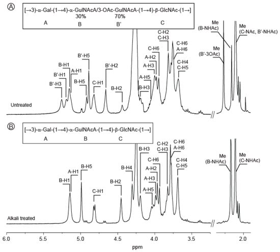 After an alkaline treatment of the polysaccharide, the 1H spectrum (Figure 1B) was simplified and three anomeric signals instead of four were then observed (A-H1 = 5.14 ppm; B-H1 = 5.14 ppm and C-H1 = 4.81 ppm). This alkaline treatment leads to the removal of one acetyl group (B’-3OAc = 2.27 ppm). Integration of the anomeric protons demonstrated an equimolar occurrence of the three residues A, B and C in the alkali-treated polysaccharide. Analyses of the 1D and 2D NMR spectra revealed that the ⟨-d-galactose (A) and the N-acetyl-®-d-glucosamine (C) were not modified by the alkaline treatment and that their respective ratio were also conserved. However, the amount of B residue found in the alkali-treated polysaccharide was equal to the sum of the B and B’ residues, which disappeared after alkaline treatment.