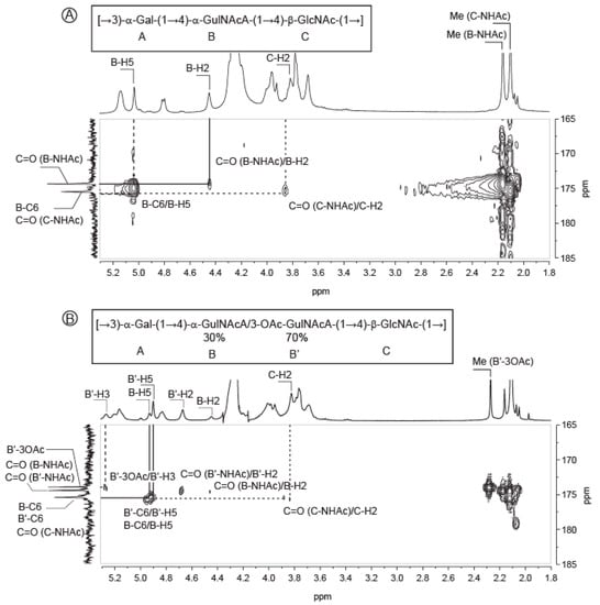Detail of the HMBC spectra recorded at 353K on Vibrio alginolyticus exopolysaccharide highlighting the acetylation of the guluronic acid residue. (A) HMBC of the deacetylated exopolysaccharide at the position 3 of the GulNAcA; (B) HMBC of the untreated exopolysaccharide.