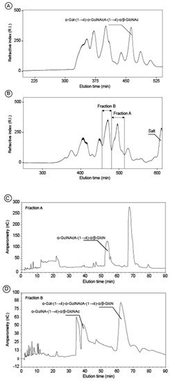 The unmodified polysaccharide was subjected to mild acid hydrolysis with 0.1 M TFA. The resulting mixtures of oligosaccharides prepared were very complex and it was therefore very difficult to isolate pure oligosaccharides for in depth NMR analyses. We found that the mild acid degradation of the alkali treated polysaccharide―the deacetylated form―gave less complex mixtures which allowed the isolation of several pure oligosaccharides. The degradation products were fractionated, at first, by permeation gel chromatography (Figure 3A,B). At this step, in the case of a polysaccharide incubation of 90 min, one collected fraction contained a pure trisaccharide (Figure 3A). The other fractions contained oligosaccharides with the same degree of polymerization (e.g. di-, trisaccharides) but with various degrees of acetylation. Indeed, in order to obtain sufficiently large amounts of small oligosaccharides, the prolonged acid hydrolysis treatment required for the cleavage of the glycosidic bond has also lead to the removal of some N-linked acetyl groups. A second step of purification by semi-preparative anion exchange was necessary to isolate pure oligosaccharides. As illustrated in Figure 3, the fractions A and B collected from the degradation products of the 300 min hydrolysis (Figure 3B) contained several oligosaccharides that could be isolated (Figure 3C,D).