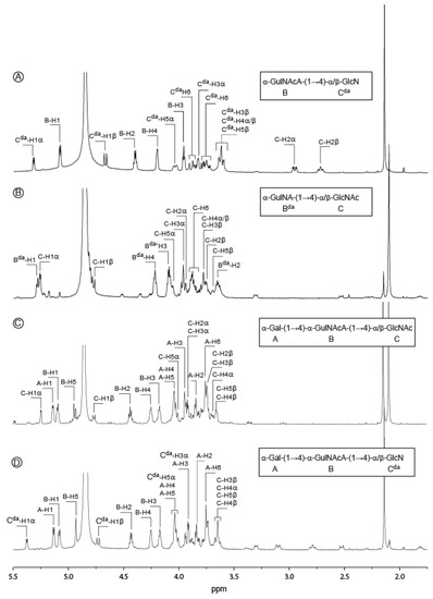 1H NMR spectra recorded at 293K of the oligosaccharides purified by chromatography. The annotated spectra correspond to two disaccharides (A,B) and two trisaccharides (C,D). Inset: chemical structure of the oligosaccharides.