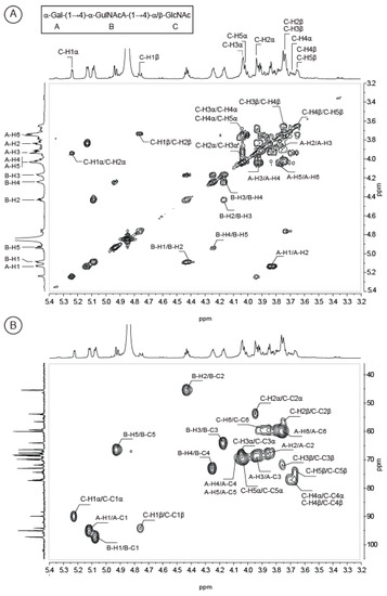 More interestingly, we purified a trisaccharide corresponding to the repetition unit of the polysaccharide eluting at 455 min in permeation gel chromatography (Figure 3A). As for the analyzed disaccharides, the C residue (GlcNAc) was located at the reducing end and the proton and carbon chemical shifts were very similar (Table 2). The ring proton of the B residue as well as the corresponding carbon were easily attributed after combining the COSY and HSQC experiments (Figure 5). The chemical shifts of the protons B-H3, B-H4 and B-H5 were higher than in the disaccharides, in agreement with its internal location in the trisaccharide instead of at the non-reducing end in the disaccharide. The ⟨(1,4) linkage between the B and C residues was validated by HMBC (Figure 6C): the correlations between the carbon B-C1 (99.06 ppm) with the protons C-H4⟨/® (3.69/3.65 ppm) and C-C4⟨/® (79.15/78.97 ppm) with the proton B-H1 (5.08 ppm) were well-identified. The expected chemical shifts of the residue A (⟨-d-Gal) were measured on the NMR spectra. The resolution of the HMBC spectra allowed clearly visualizing the linkage between the A and B residues. The anomeric carbon of the ⟨-Gal A-C1 (96.84 ppm) correlated with the proton B-H4 (4.24 ppm) and the carbon B-C4 (74.82 ppm) correlated with the proton A-H1 (5.13 ppm), demonstrating the ⟨(1,4) linkage between the two residues. Altogether, the data recorded were in agreement with a trisaccharide having the structure: ⟨-d-Gal-(1→4)-⟨-l-GulNAcA-(1→4)-⟨/®-d-GlcNAc.