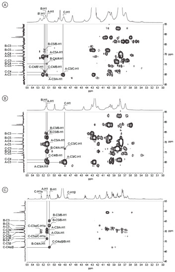 Detail of HMBC spectra. The spectra were recorded at 353K on the complete polysaccharide (A) and after alkali-treatment (B), and at 293K on the trisaccharide (C). 1H/13C heteronuclear correlations that helped to determine linkages between residues are indicated in the spectra.
