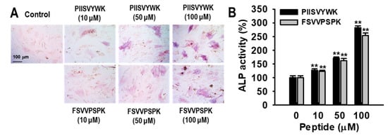 Effect of PIISVYWK and FSVVPSPK on alkaline phosphatase (ALP) activity in osteoblast differentiation of human bone marrow-derived mesenchymal stem cells (hBMMSCs). (A) Representative image of ALP staining and (B) quantification of ALP activity. hBMMSCs were treated with peptides in an osteogenic medium for 7 days. Values are presented as means ± SD of four independent determinations (n = 4). ** p < 0.01 vs. non-treatment group.