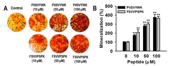 PIISVYWK and FSVVPSPK promoted mineralization in osteoblast differentiation of hBMMSCs. (A) Representative images of Alizarin Red S (ARS) and (B) quantification of mineralization. hBMMSCs were treated with peptides in an osteogenic medium for 21 days. Values are presented as means ± SD of four independent determinations (n = 4). ** p < 0.01 vs. non-treatment group.
