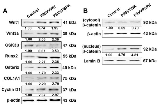 The canonical Wnt/β-catenin signaling pathway is known to be involved in osteoblast differentiation of MSCs []. To understand the underlying molecular mechanism of hBMMSC differentiation into osteoblasts with PIISVYWK and FSVVPSPK, activation of the Wnt/β-catenin signaling pathway was investigated via Western blotting, immunofluorescence, and RT-qPCR. First, the effects of PIISVYWK and FSVVPSPK on protein expression of Wnt ligands, GSK3β, Runx2, OSX, COL1A1, cyclin D1, as well as β-catenin in the cytosolic and nuclear fractions, were examined. As shown in Figure 3A, hBMMSCs treated with the peptides showed upregulation of Wnt1, Wnt3a, Runx2, OSX, COL1A1, and cyclin D1, and downregulation of GSK3β. Protein expression of β-catenin in the cytosolic and nucleus fractions showed downregulation of cytosolic β-catenin and upregulation of nuclear β-catenin, indicating translocation of β-catenin into the nucleus (Figure 3B). An immunofluorescence assay was performed after treating the peptides to confirm nuclear translocation of β-catenin. As seen in Figure 4, immunofluorescence analysis showed that PIISVYWK and FSVVPSPK rapidly stimulated nuclear translocation of β-catenin in hBMMSCs. mRNA expression of Wnt1, Wnt3a, Runx2, OSX, COL1A1, cyclin D1, and β-catenin was significantly increased in the presence of PIISVYWK and FSVVPSPK (Figure 5).