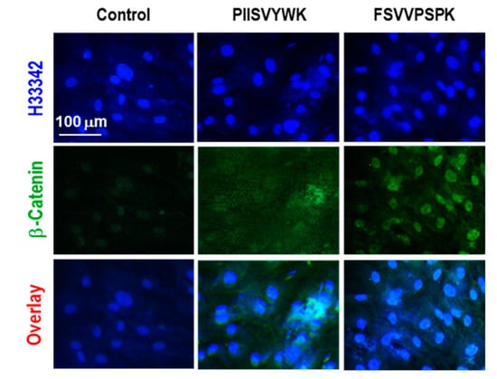 Cells were grown on glass coverslips and incubated with PIISVYWK and FSVVPSPK for 4 days. The cells were rinsed with ice-cold PBS twice and fixed with 3.7% paraformaldehyde in PBS for 15 min, followed by permeabilization with 0.1% Triton X-100 in PBS for 15 min. The cells were blocked with 2% bovine serum albumin for 60 min and then incubated with a β-catenin antibody conjugated with Alexa Flour 488 (1:500 dilution, Santa Cruz Biotechnology) in 0.1% BSA for 3 h at room temperature, followed by staining with Hoechst 33342 (2 μg/mL) for 15 min. The cells were washed with PBS three times and viewed on a fluorescence microscope (Leica, Wetzlar, Germany).