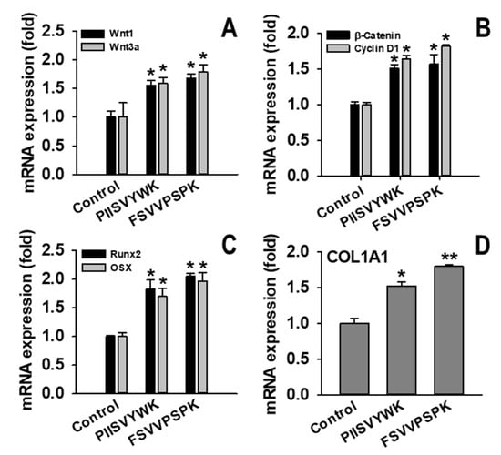 Effect of PIISVYWK and FSVVPSPK on mRNA expression of Wnt/β-catenin signaling in osteoblast differentiation of hBMMSCs. (A) Wnt1 and Wnt3a, (B) β-catenin and cyclin D1, (C) Runx2 and OSX, and (D) COL1A1. Cells were cultured in osteogenic medium with PIISVYWK and FSVVPSPK (100 μM) for 7 or 4 days (only for β-catenin). mRNA expression was assessed using RT-qPCR. Values are presented as means ± SD of three independent determinations (n = 3). * p < 0.05, ** p < 0.01 vs. control group (without peptide treatment).