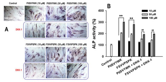 DKK-1 treatment abolished PIISVYWK- and FSVVPSPK-mediated ALP activity in osteoblast differentiation of hBMMSCs. (A) Representative images of ALP staining and (B) quantification of ALP activity. Cells were exposed to DKK-1 (100 ng/mL) for 1 h, followed by the addition of PIISVYWK and FSVVPSPK, and incubated for 7 days. Values are presented as means ± SD of four independent determinations (n = 4). ** p < 0.01 vs. control group (without peptide treatment), ## p < 0.01 vs. PIISVYWK and FSVVPSPK.