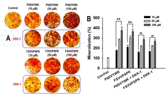 DKK-1 treatment abolished PIISVYWK- and FSVVPSPK-mediated mineralization in osteoblast differentiation of hBMMSCs. (A) Representative images of ARS and (B) quantification of mineralization. Cells were exposed to DKK-1 (100 ng/mL) for 1 h, followed by addition of PIISVYWK and FSVVPSPK, and incubated for 21 days. Values are presented as means ± SD of four independent determinations (n = 4). ** p < 0.01 vs. control group (without peptide treatment), ## p < 0.01 vs. PIISVYWK and FSVVPSPK.