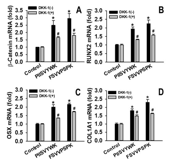 Effect of DKK-1 on mRNA expression of (A) β-catenin, (B) Runx2, (C) OSX, and (D) COL1A1 in PIISVYWK- and FSVVPSPK-mediated osteoblast differentiation in hBMMSCs. Cells were exposed to DKK-1 (100 ng/mL) for 1 h, followed by addition of PIISVYWK and FSVVPSPK, and incubated for 7 or 4 days (only for β-catenin). Values are presented as means ± SD of three independent determinations (n = 3). * p < 0.01 vs. control group (without peptide treatment), # p < 0.01 vs. PIISVYWK and FSVVPSPK without DKK-1.