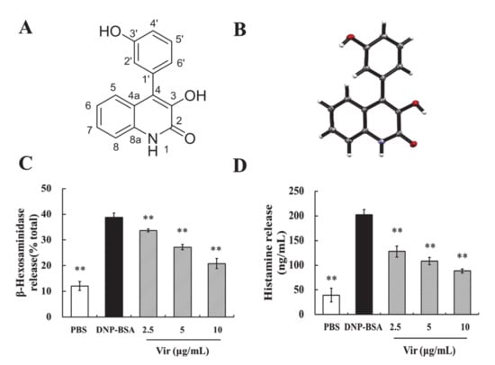 The X-ray crystallography and degranulation efficiency of viridicatol. (A) Chemical structure of viridicatol. (B) The X-ray crystallography of viridicatol. (C) Effects of viridicatol on degranulation. Cells were incubated with 200 ng/mL of dinitrophenyl (DNP)-specific immunoglobulin E (IgE) for 16 h in 48-well plates. The medium was replaced by Tyrode’s buffer containing the indicated concentrations of viridicatol (2.5, 5, and 10 µg/mL) followed by stimulation with 500 ng/mL DNP-bovine serum albumin (BSA) for 1 h. The release of β-hexosaminidase was measured. (D) Effects of viridicatol on histamine release. The cells were sensitized and treated as described in (C), except for stimulation with DNP-BSA for 15 min, and the level of histamine was measured using an ELISA kit. ** p < 0.01 compared with the DNP-BSA group. The data represent the mean ± SD of three repeated experiments. Vir: viridicatol.