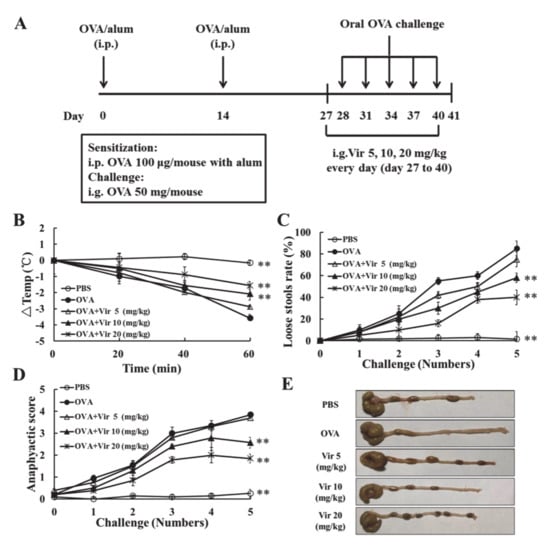 Food allergy model and effects of viridicatol on the allergic symptoms. (A) Food allergy model. Mice were sensitized with 100 µg ovalbumin (OVA) and 2 mg alum in 200 µL of phosphate-buffered saline (PBS) by intraperitoneal injection, orally challenged with 50 mg OVA in 200 µL PBS, and the viridicatol concentrates (5, 10, 20 mg/kg) were orally administered. (B) The rectal temperature was measured 1 h after the fifth OVA challenge. (C) The rate of loose stools was measured 1 h after each OVA challenge. (D) The anaphylactic score was measured 1 h after each OVA challenge. (E) The representative large macroscopic view of the intestine in each group of mice. ** p < 0.01 compared with the OVA group. The data represent the mean ± SD. Vir: viridicatol.