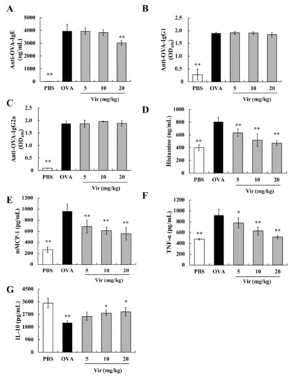 The levels of immunoglobulins, anaphylactic mediators, and cytokines in serum (n = 6). (A) The level of OVA-specific IgE. (B) The level of anti-OVA IgG1. (C) The level of anti-OVA IgG2a. (D) The level of histamine. (E) The level of mMCP-1. (F) The level of TNF-α. (G) The level of IL-10. In (A,B,C,F,G), serum was from retro-orbital blood collection on day 41. In (D,E), the serum from the mice tail veins was collected within 1 h after the last challenge. * p < 0.05, ** p < 0.01 compared with the OVA group. The data represent the mean ± SD. Vir: viridicatol.